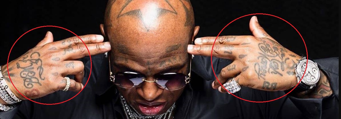 Sens: Les BM Jr sur ses deux mains sont pour son fils, pour qui il a fait les tatouages, Bryan Williams Jr. Cash Money est le nom de sa maison de disques et RR est le nom d’un autre rappeur qui est aussi l’ami proche de Birdman.