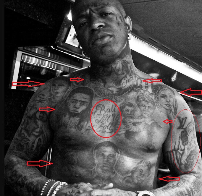 Tatouage: Tout le corps de Birdman est couvert de tatouages uniques. Son cou contient une citation encrée sur laquelle, un grand tatouage d’étoile a été ajouté maintenant. La partie médiane de sa poitrine contient les lignes, “Balle jusqu’à ce que tu meurs» tatoué dessus. Son épaule gauche contient un tatouage de un portrait d’une fille aux cheveux tressés. Son pectoral gauche contient un tatouage de un portrait de femme tenant un enfant dans ses bras. L’épaule droite de Birdman contient un tatouage de un portrait d’un garçon. Son pectoral gauche contient un grand tatouage du portrait du rappeur Lil Wayne avec son nom tatoué en dessous de lui en flammes. L’estomac de Birdman contient un grand tatouage de trois autres hommes. Son ventre a un tatouage de un portrait d’un vieil homme et deux jeunes garçons portant des casquettes de chaque côté. Le bras supérieur gauche du rappeur contient également tatouages de deux signes dollar avec le Logo Louis Vuitton tatoué dessus.