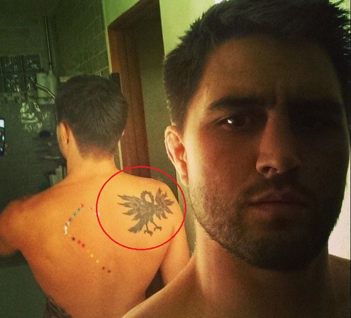 入れ墨: 彼の背中上部の左側には ハゲタカの入れ墨.