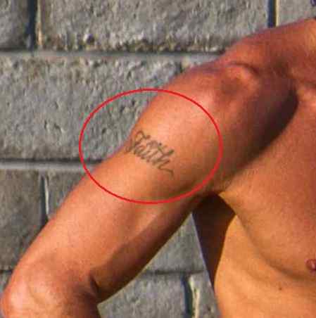 入れ墨: ティムの右上腕にも「信仰」という言葉のタトゥーがあります.