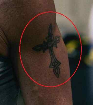 入れ墨: 歌手の左上腕には華やかな十字架が刺青されています。十字架にもさまざまな文字が入れ墨されています.