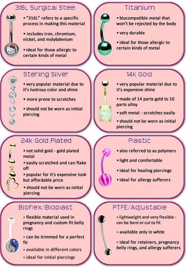 Najpogostejši možnosti pri izbiri materiala za nakit sta titan in jeklena palica iz kirurškega jekla. Izbrati morate material iz titana, ker je med obema boljši. To je zato, ker je verjetneje, da bo na vaši koži sprožil kakršno koli alergijsko reakcijo. Če menite, da imate občutljiv tip kože, boste morda želeli kos prožnejšega nakita, ki bo pripomogel k boljšemu zdravljenju. Nato lahko zaprosite za obroček iz popka iz PTFE, ki je znan tudi pod imenom Bioflex ali Bioplast. Ta vrsta nakita je še posebej koristna, če se ukvarjate s športom (to je, če vam trener najprej dovoli obdržati piercing) ali ste noseči. Preden obiščete studio in naredite piercing, se morate prepričati o vrsti nakita in piercinga, ki ga pozneje ne boste mogli obdržati..