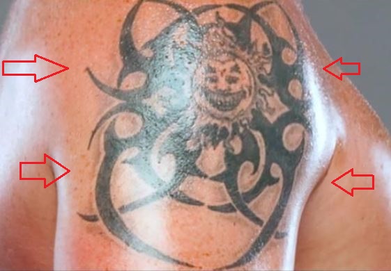 Tatouage: Il y a un motif de points tatoués sur le haut du bras droit du lutteur, juste au-dessus de son coude. Il y en a un similaire sur son bras gauche aussi.