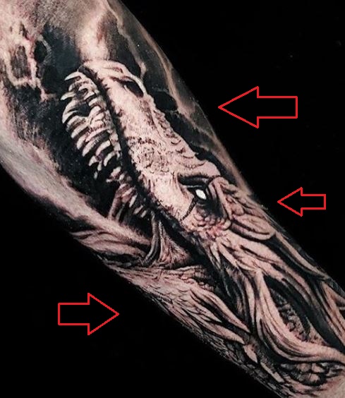 Tatouage: Il y a un grand tatouage du visage d’un dragon, crachant du feu sur le côté extérieur de son avant-bras droit.