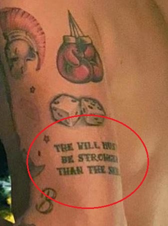 Tatouage: Le côté extérieur de son bras gauche contient la citation “LA VOLONTÉ DOIT ÊTRE PLUS FORT QUE LA COMPÉTENCE” tatouée dessus..