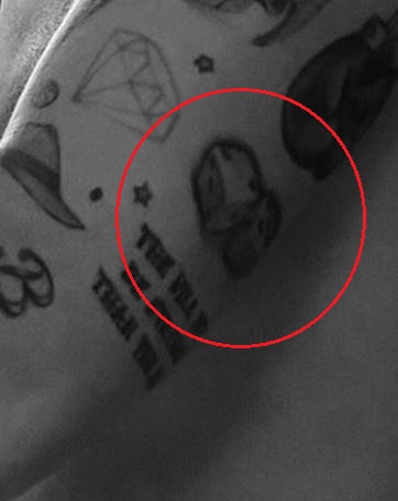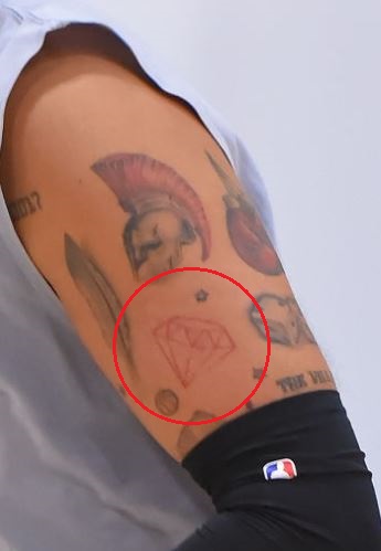 Tatouage: Il y a aussi un tatouage d’un diamant sur le haut de son bras gauche, fait à l’encre rouge. Le diamant est également entouré de trois petites étoiles.
