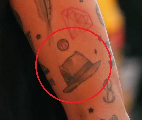 Tatouage: Il y a un tatouage d’un chapeau sur le haut de son bras, avec une petite plume dessus. Il y a aussi un tatouage d’un petit basket, juste au dessus du chapeau.