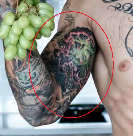 Tatouage: Le biceps droit de l’athlète a un tatouage de la galaxie dessus, montrant une explosion verte d’un vaisseau spatial dans l’espace avec de petites roches et des débris flottant en dessous..