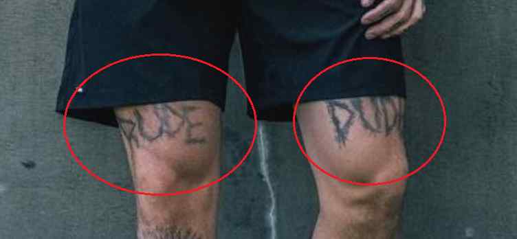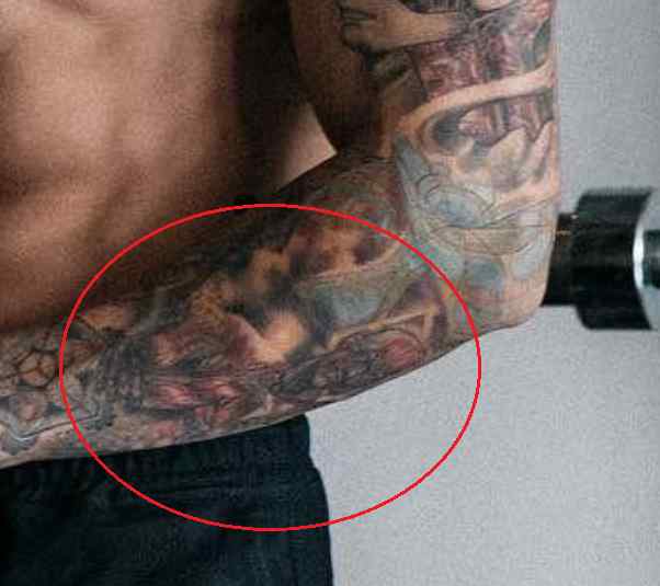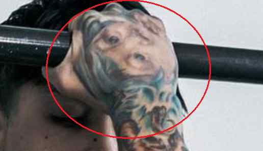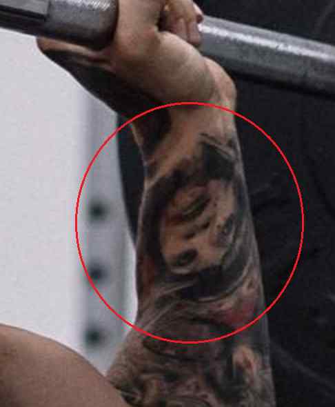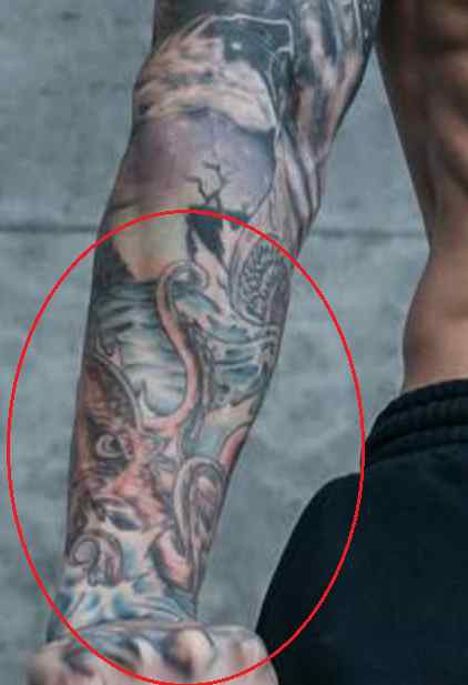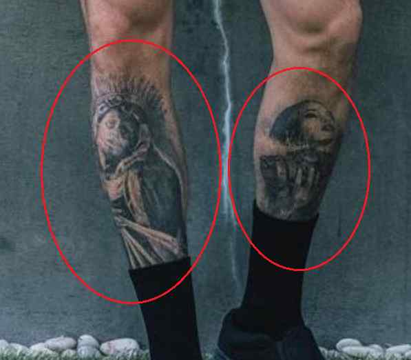 Tatouage: Le bas de la jambe droite de l’athlète a un tatouage d’un homme, vêtu d’une robe regardant vers le haut avec une expression mélancolique, avec des rayons de lumière venant de derrière sa tête. Sa jambe gauche a un tatouage du visage d’une femme avec des pièces de machine tatouées en dessous.