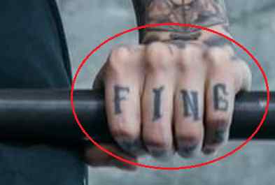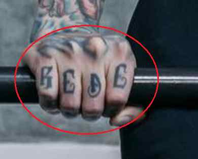 Tatouage : ses deux mains portent des lettres tatouées. Sa main droite a les lettres “REDE” et “THIS” tatouées dessus, et sa main gauche a les mots “FINE” et “MESS” dessus. Les lettres épellent les mots « REDÉFINIR CE MESSAGE »