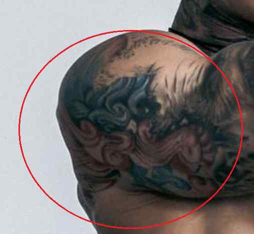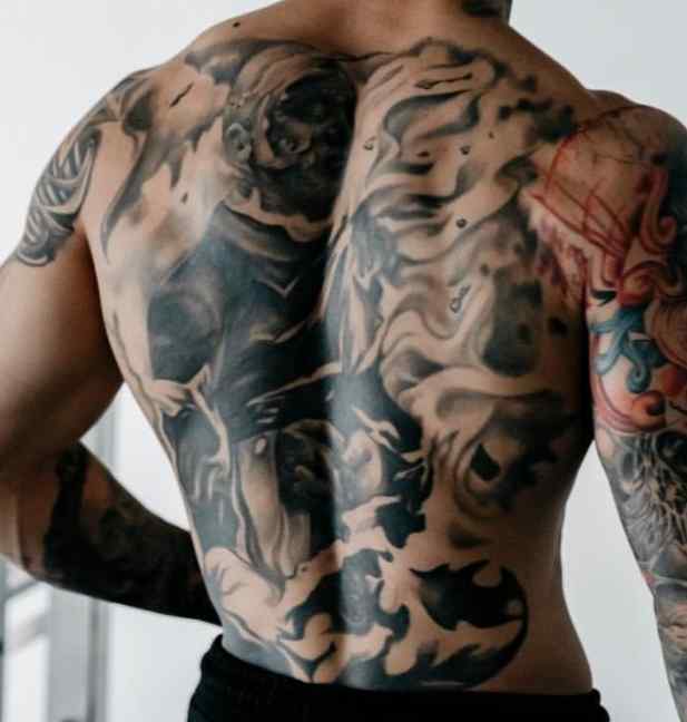 Tatouage: Le dos de l’athlète a l’un des plus grands dessins de tatouage de son corps. Son dos a un tatouage du haut du corps d’un guerrier en noir entouré de motifs smokey noirs et gris. Le visage du guerrier est sombre, carbonisé et est également entouré de nuages.