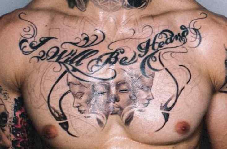 Tatouage: Il y a une citation, “Je serai entendu” tatoué sur sa poitrine. La citation a également des lignes tourbillonnantes qui descendent jusqu’à sa poitrine enveloppant trois visages. Il y a un visage au milieu et un dans les deux sens. Tous les visages ont les yeux fermés.