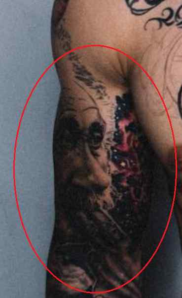 Tatouage: Il y a aussi deux visages tatoués sur le haut de son bras gauche et son épaule. La première est celle d’un homme à grande barbe, avec deux interprétations de son visage devant un dessin géométrique. En dessous, il y a un autre tatouage du visage d’un robot dont la peau s’écaille révélant un enfant dans son cerveau.