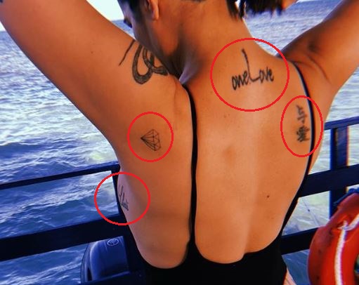 Tatouage: Le dos de l’actrice contient plusieurs tatouages. Le côté gauche du haut de son dos contient un tatouage de diamant. La zone médiane du haut de son dos, juste en dessous de son cou, contient le mot “oneLove” tatoué dessus. Un peu à droite des mots se trouvent deux caractères chinois tatoués. Le côté gauche de son corps, à gauche de sa poitrine, contient le mot « Liberté » tatoué dessus.