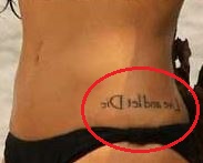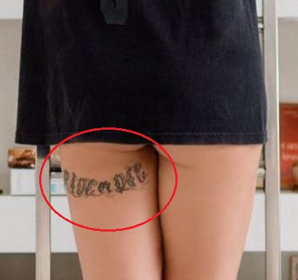 Tatouage: L’arrière de sa jambe gauche, juste en dessous de sa hanche, est un autre tatouage d’une citation qui dit : “ROULER ou MOURIR“