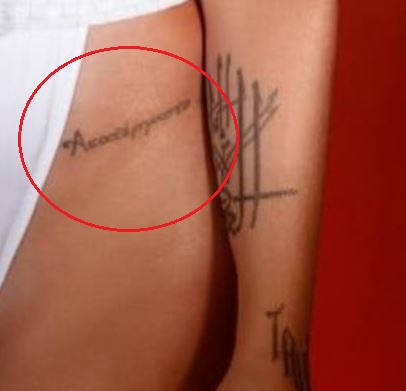 Tatouage: Le bras droit de l’actrice, juste au-dessus du coude, contient une citation tatouée qui entoure son bras comme une bande. La citation se lit comme suit : “Le But La Vie C’est La Maturation De L’ame“