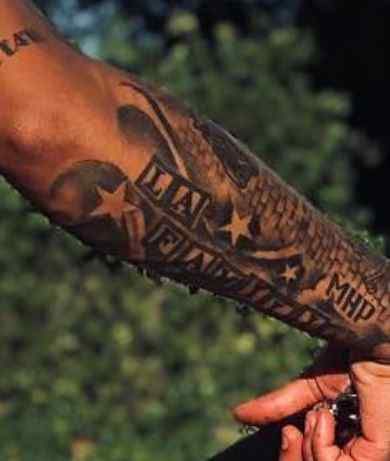 Tatouage: Le côté de son avant-bras droit a un tatouage de quelques étoiles dessus avec des blocs de lettres qui disent “LA FAMILY”