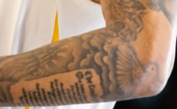 Sens: Le tatouage de la colombe sur son bras représente l’amour et le Saint-Esprit.