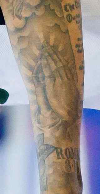Tatouage: La partie supérieure de son avant-bras gauche a un tatouage d’une paire de mains jointes en prière. Les mots « ROMAINS 8 :18 » sont également tatoués près de son poignet. L’ensemble du design est entouré de nuages.