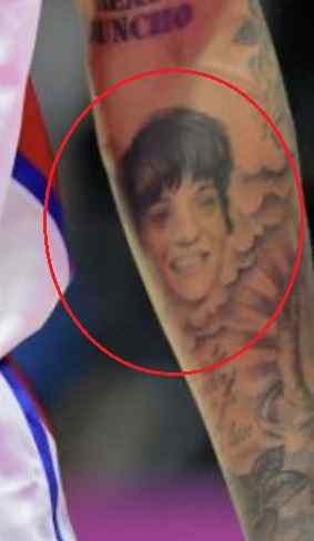 Tatouage: L’arrière de son bras droit a un autre visage tatoué dessus. Les mots « IN LOVING MEMORY » sont tatoués au-dessus du portrait et la date de naissance et de décès est tatouée en dessous..