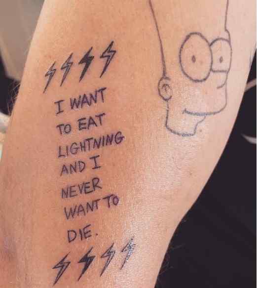 Tatouage: Il y a une citation tatouée sur son bras droit, avec des éclairs au-dessus et en dessous. La citation se lit comme suit : « JE VEUX MANGER DE LA FOUDRE ET JE NE VEUX JAMAIS MOURIR ». Le visage de Bart Simpson du dessin animé Les Simpson est également tatoué juste à côté de la citation.