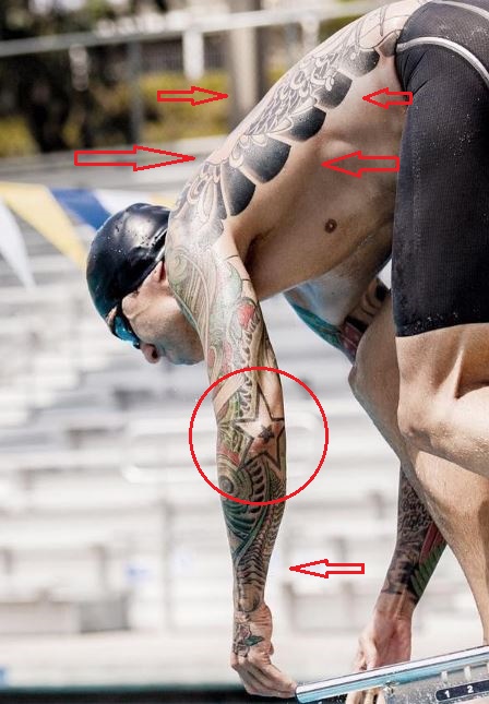 Tatouage: Le bras gauche du nageur, tout comme son droit, est entièrement recouvert, inspiré des tatouages de la vie marine. Il contient des écailles, des algues, de grandes feuilles et des motifs de tourbillon qui couvrent tout son bras et son épaule gauche.