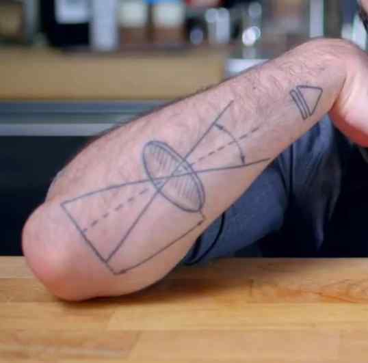 A tatuagem do desenho geométrico é um diagrama da distância focal de uma lente. Ele fez essa tatuagem porque foi para a escola de cinema e também é cineasta.