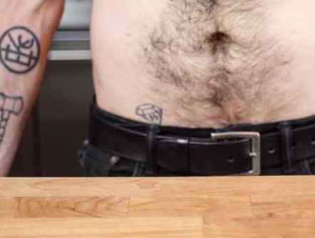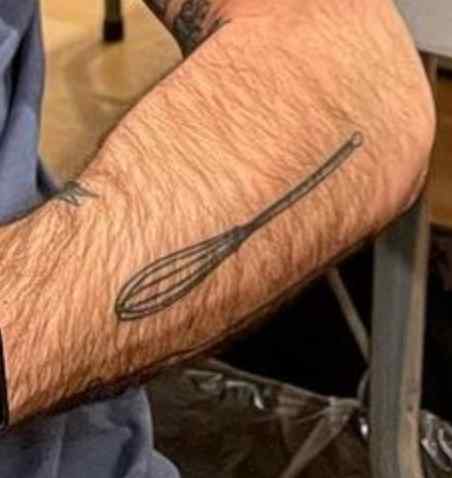 Tatuagem: O braço esquerdo do cozinheiro também tem um desenho minúsculo de uma galinha exalando fogo.