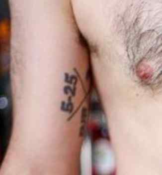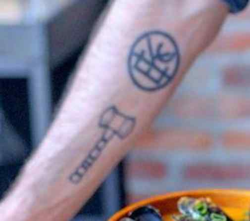 Tatuagem: Há uma tatuagem de um martelo, junto com um símbolo circular na parte interna de seu antebraço direito.