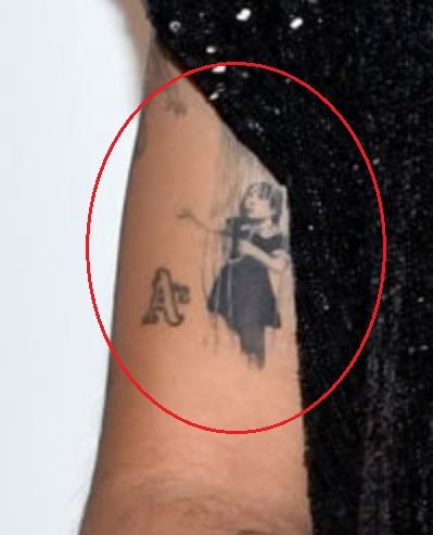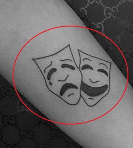 Significado: As máscaras em seu braço são conhecidas como “Comédia e Tragédia” e são utilizadas para representar o teatro, pois as expressões por estas apresentadas são as principais que os atores devem mostrar. As máscaras também representam a perspectiva de que a vida mostre seu quinhão de felicidade e tristeza.