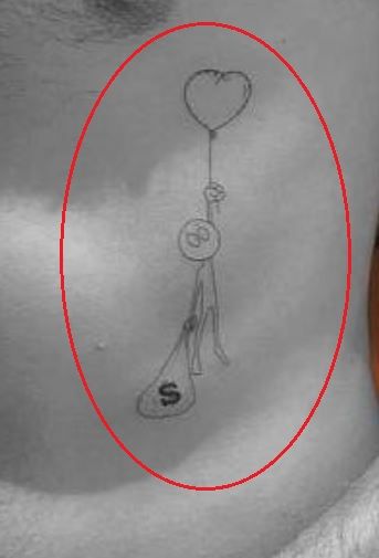 Significado: A tatuagem do desenho ao seu lado mostra um profundo significado da batalha entre amor e dinheiro. Às vezes é preciso escolher uma das coisas, mas não queremos viver sem nenhuma.