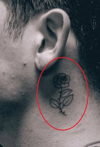 Tatuagem: O lado esquerdo do pescoço tem uma flor rosa tatuada com um caule com duas folhas, coberto de espinhos.