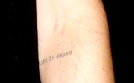 Tatuagem: A parte interna de seu antebraço esquerdo também tem uma frase tatuada onde seu cotovelo dobra. A citação diz: “A VIDA É GRANDE”.
