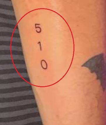 Tatuagem: A parte de trás de seu antebraço direito tem o número, “510” tatuado nele.