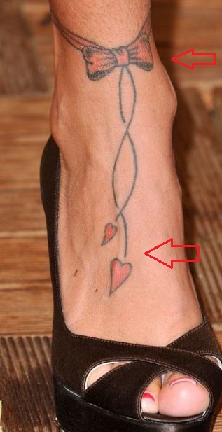 Tatuagem: O tornozelo direito da cantora contém uma fita amarrada em torno dele que vem para a frente e forma um laço. Também há duas cordas descendo, emaranhadas, do arco, terminando com dois pequenos corações perto dos dedos dos pés.