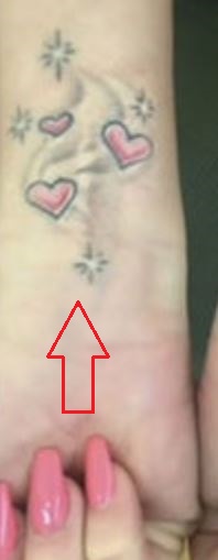 Tatuagem: A parte inferior de seu pulso direito contém uma tatuagem de três pequenos corações vermelhos junto com estrelas. A tatuagem é completada por linhas esfumadas feitas no fundo.