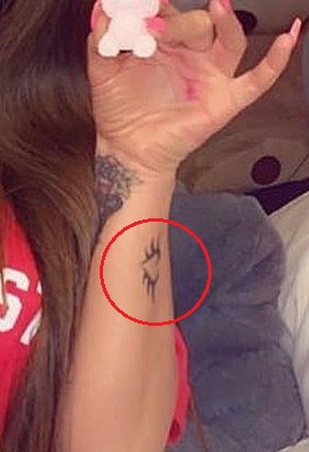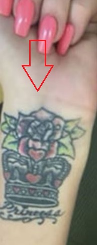 Tatuagem: O lado interno de seu pulso esquerdo contém uma tatuagem da coroa de uma rainha. Há uma tatuagem de uma flor rosa logo acima da coroa. A palavra, “Princesa”Está tatuado abaixo da coroa.