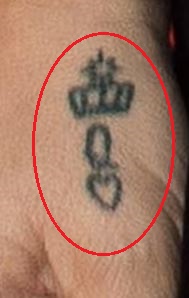 Tatuagem: A parte superior do polegar direito contém a tatuagem de uma coroa junto com um microfone com um coração como alça.