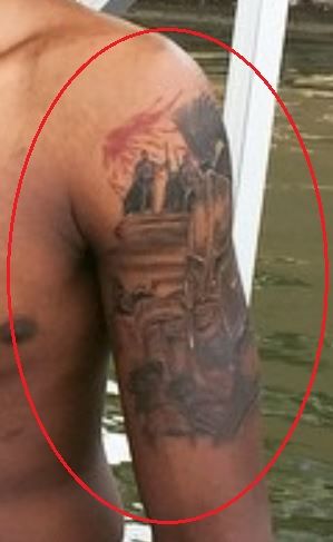 Tatuagem: A parte interna do antebraço direito também tem uma pedra tatuada com o número “14”..