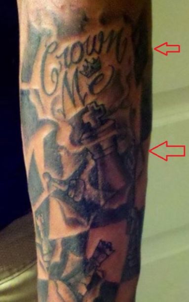 Tatuagem: A parte superior de seu antebraço esquerdo está coberta por uma tatuagem de peças de xadrez que estão entrando, mescladas com o tabuleiro de xadrez. Há uma grande peça de xadrez do Rei bem no meio com as palavras “Coroa-me” tatuadas acima dela. Há também uma pequena coroa tatuada acima da palavra “eu”