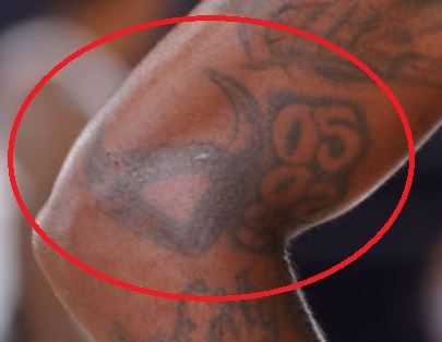 Tatuagem: Os números “05, 02 e 90” estão tatuados em seu cotovelo direito. Há também um desenho que consiste em um desenho triangular com grandes chifres tatuados ao lado do número.