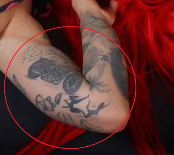 Tatuagem: Há uma grande garota pinup tatuada no braço esquerdo da modelo. A menina também tem uma pequena vela, um espelho, um pincel de maquiagem, um par de dados, roupa íntima e pontinhos minúsculos ao seu redor.