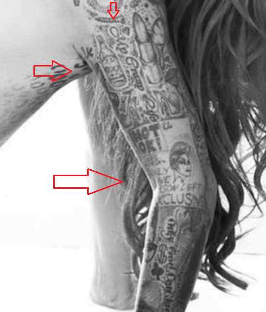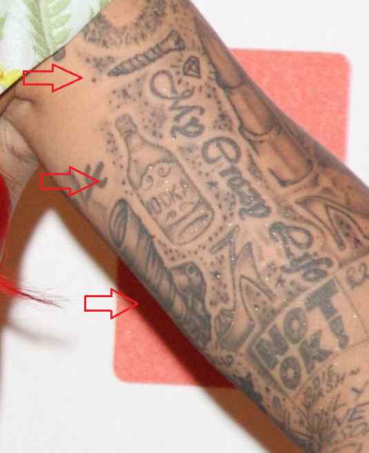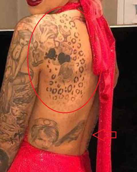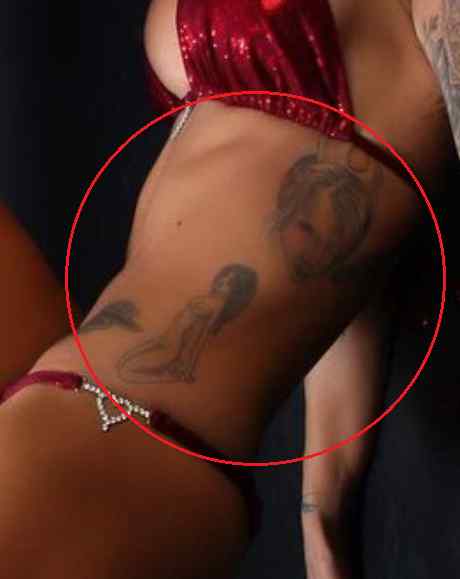 Tatuagem: O lado esquerdo de seu corpo tem uma tatuagem do rosto de uma mulher que usa uma coroa. Há também uma tatuagem de uma garota nua abaixo do retrato.