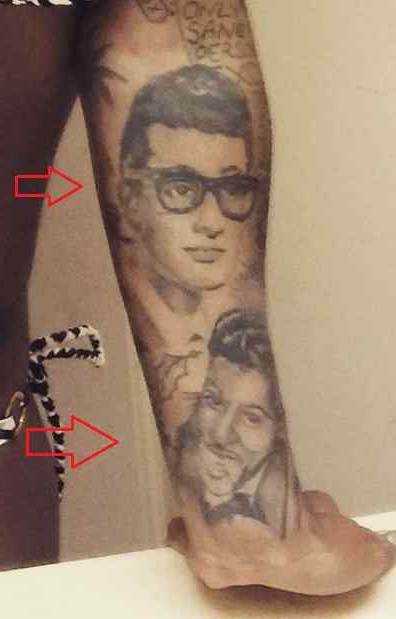 Significado: As tatuagens dos retratos em seu antebraço também são de seus ídolos. O primeiro é de Buddy Holly e o segundo é de Chuck Berry.