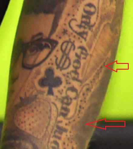 Tatuagem: Há uma frase tatuada em seu antebraço esquerdo que diz: “Somente Deus pode me julgar”. A citação também tem uma cenoura, um cifrão, um clube e um morango ao lado.