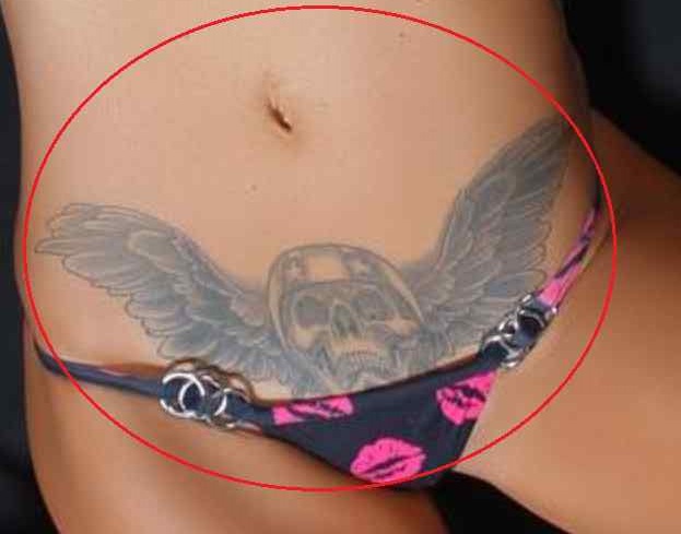 Tatuagem: Há uma caveira tatuada na barriga de Jodie que está usando um capacete e também tem asas.