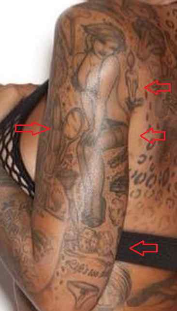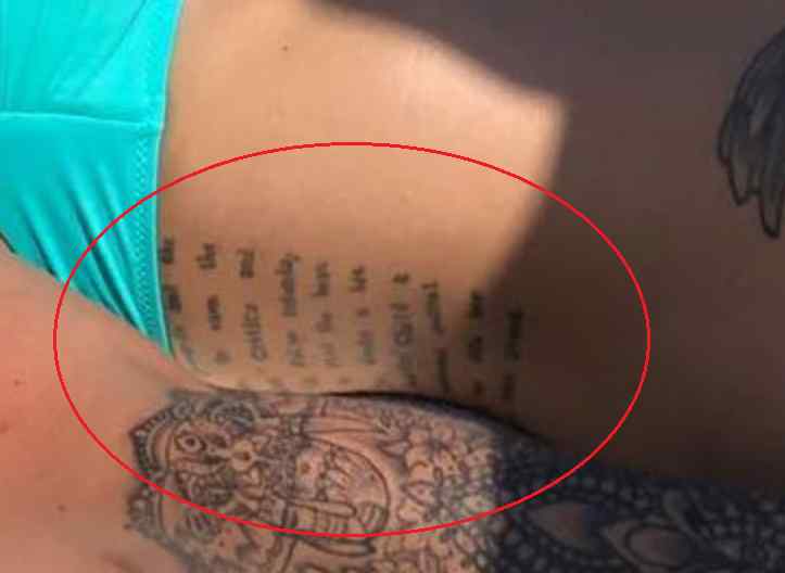 Tatuagem: O é um parágrafo tatuado no lado direito do corpo dela também.