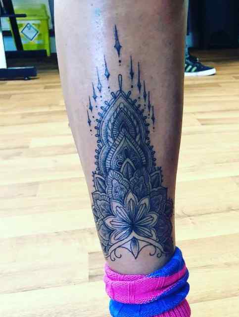 Tatuagem: A parte frontal da perna direita também tem um desenho intrincado tatuado nela.