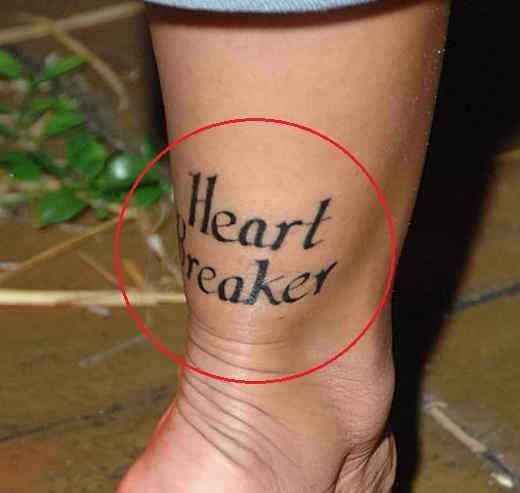 Tatuagem: As palavras “Heart Breaker” estão tatuadas na parte de trás da perna esquerda, um pouco acima do tornozelo.