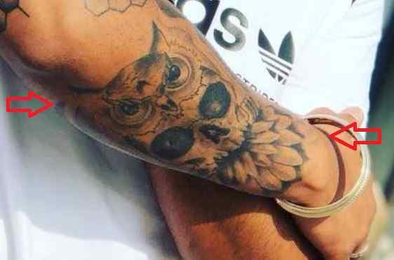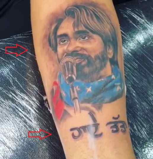 Tatuagem: A parte interna de seu antebraço esquerdo tem um retrato de um homem tatuado nele com um microfone à sua frente. As palavras “ਹਾਏ ਤੱਤਾ” também estão tatuadas abaixo do retrato.